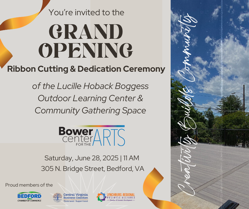 The official Ribbon Cutting and Dedication Ceremony will take place on Saturday, June 28 at 11 AM. This ceremony will be facilitated by the Bedford Area Chamber of Commerce, Central Virginia Business Coalition, and Lynchburg Regional Business Alliance—Bower Center of the Arts is a proud member of all three business organizations. The celebration will include light refreshments, opportunities to explore the new space, meet some of the volunteers, and hear from those who made it possible. Although Lucille will not be present due to mobility issues, her family will attend on her behalf.