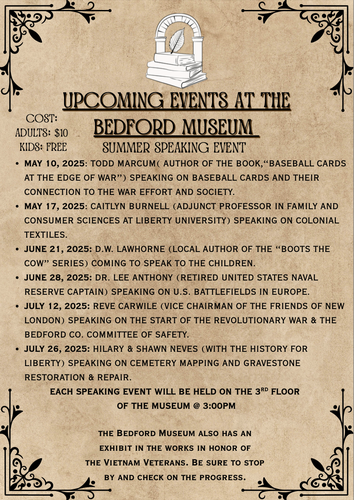 The Bedford Museum and Genealogical Library proudly presents a Summer Speaking Event!